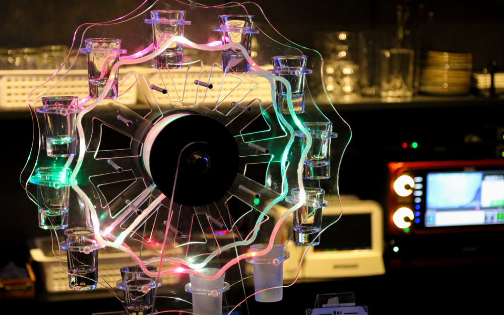 12杯のショットが回転するテキーラ観覧車。 LEDライトが綺麗でロシアンルーレットなど飲み方は様々!